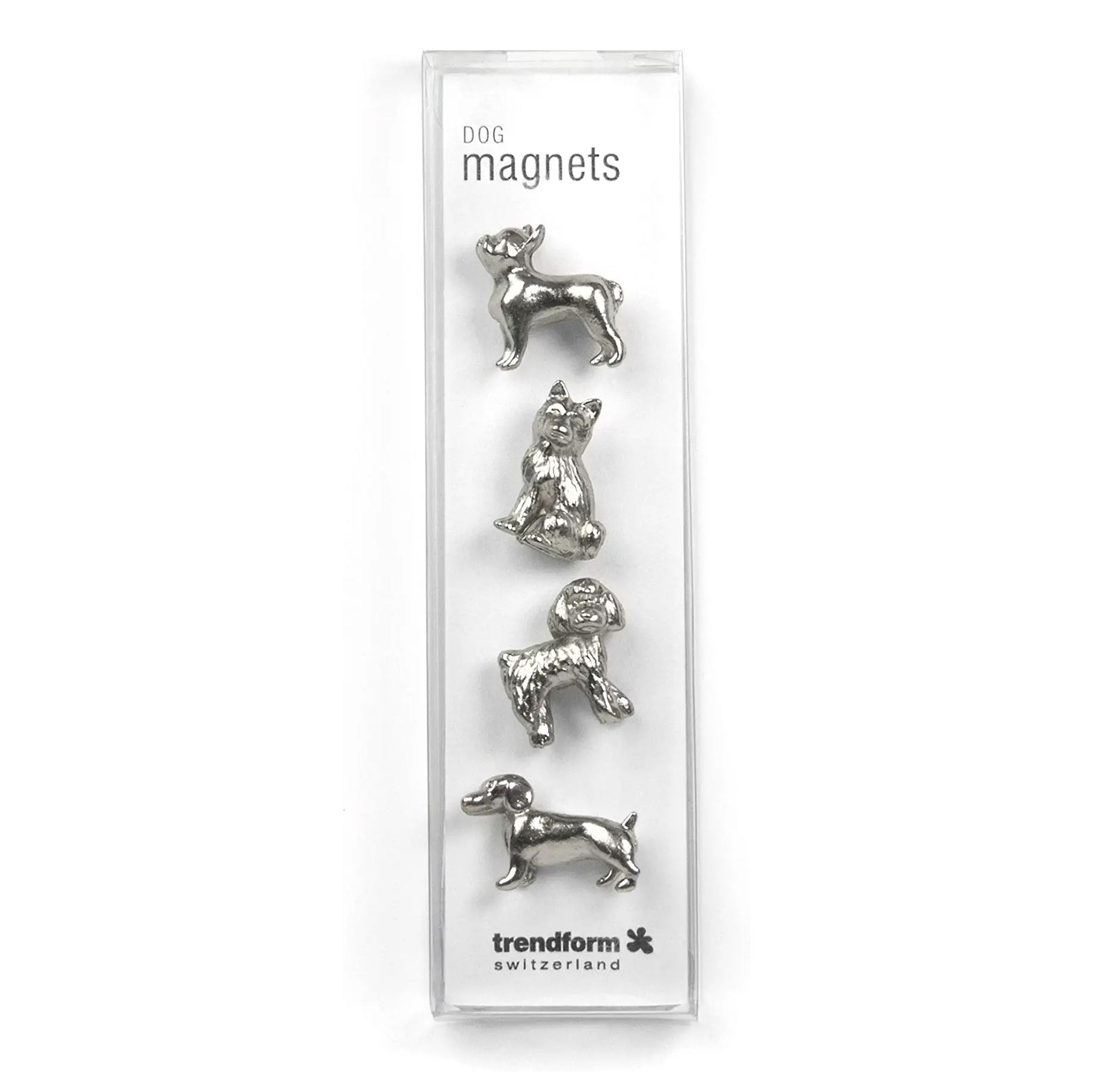 Set van 4 zilverkleurige magneten in de vorm van verschillende honden. Vier sterke magneten van het merk Trendform.